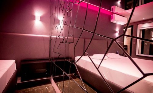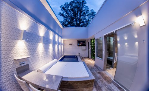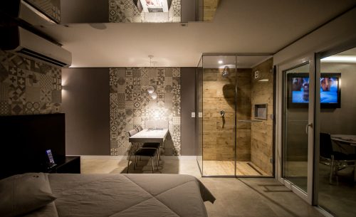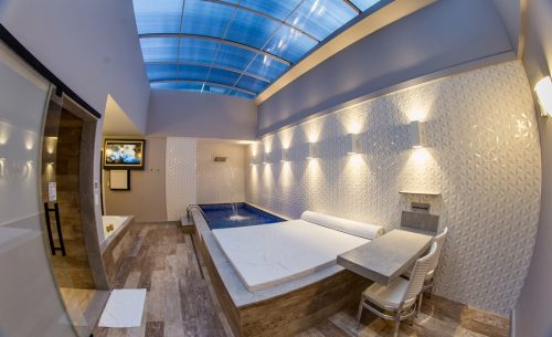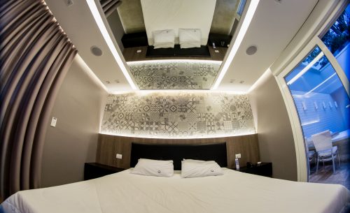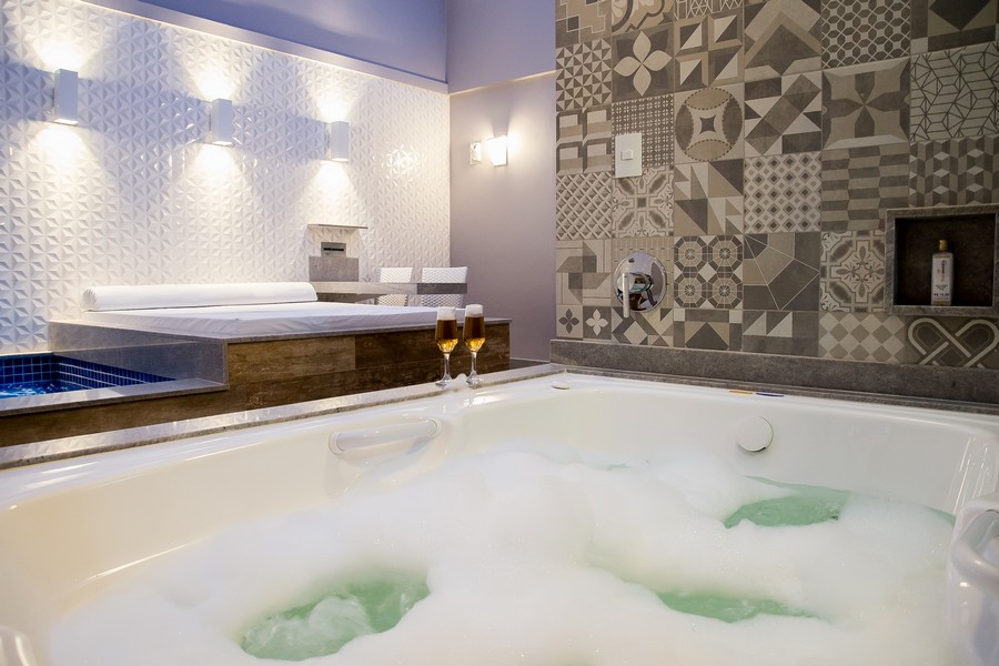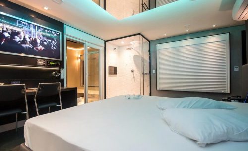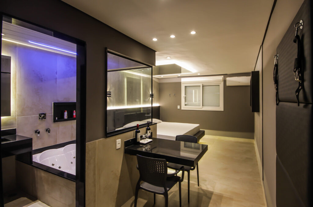 Nova suíte Acqua Plus com decoração ultra moderna, interativa por tablete integrado com controle de luzes e NetFlix, piscina aquecida, spa com hidromassagem, teto solar, ar-condicionado split, canais eróticos, internet Wi-Fi, som com Bluetooth , 2 TV’s de LED 65″, TV por assinatura, secador de cabelos, frigobar, cama king size, espelho no teto, painel eróticos com chicote, chibatas, algemas; além de garagem privativa.