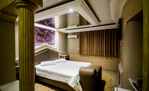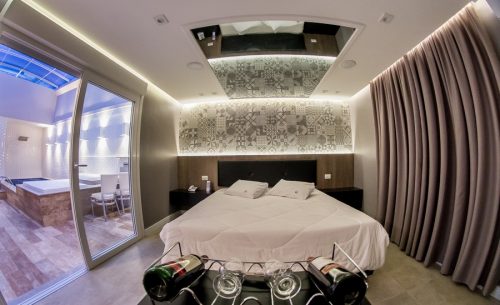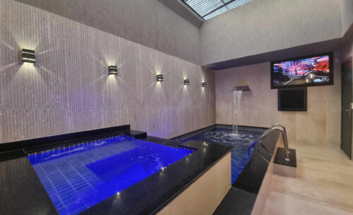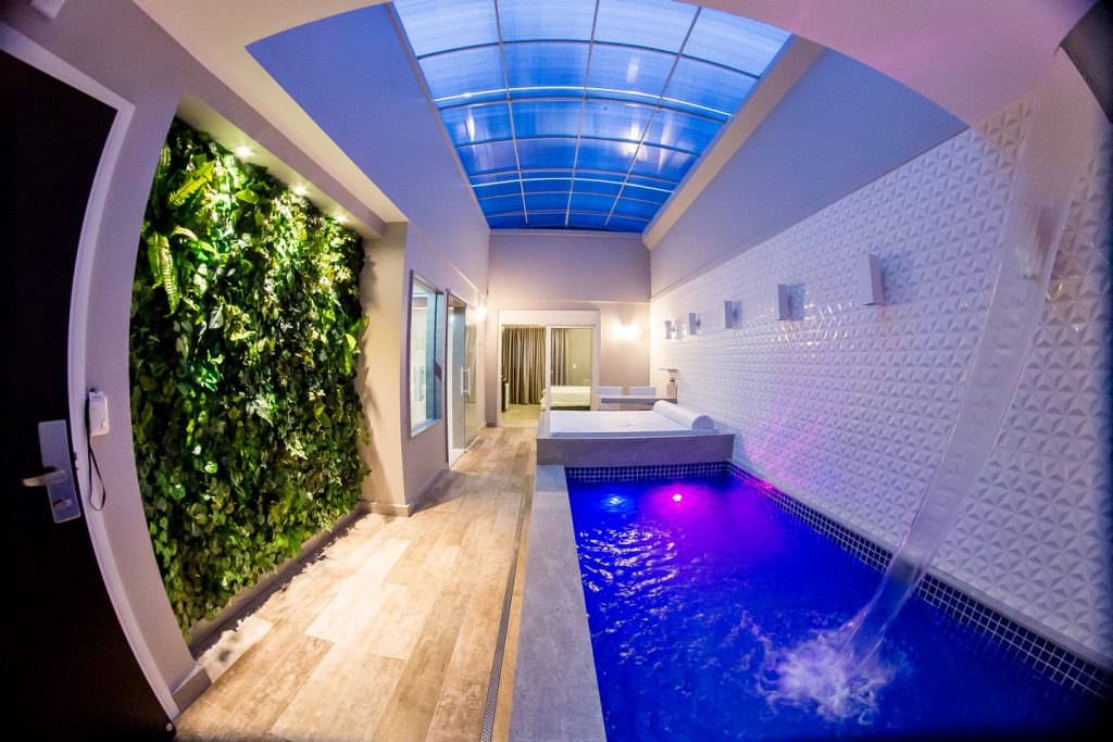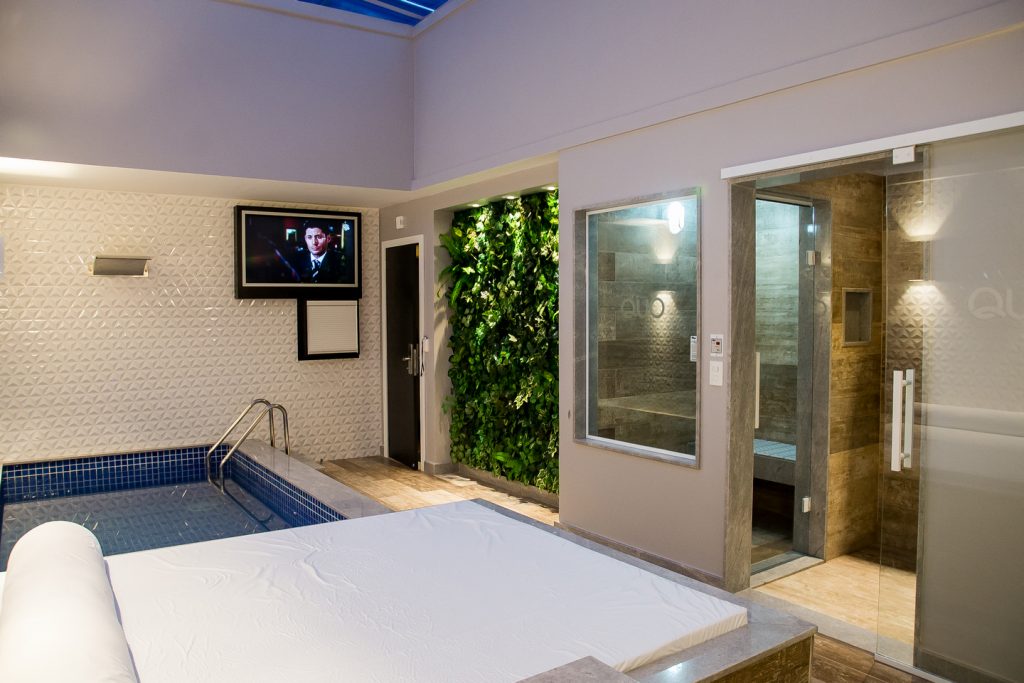 Na Suíte Piscina Quo com decoração ultra moderna, piscina aquecida com cascata, sauna além da Garagem privativa, ar-condicionado split, canais eróticos, temos internet Wi-Fi, painel integrado de controle de luzes, além som com seleção com mais de 4.000 músicas no repertório com (8 estilos musicais), 2 TV’s de LED 50″, TV por assinatura, secador de cabelos, frigobar, 2 camas, king size e espelho no teto.